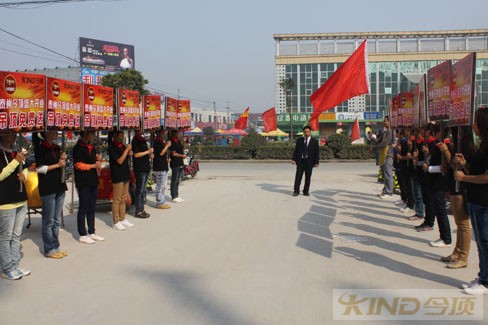 泰州今頂,緊隨工廠步伐,堅持品牌化發展,不僅在店面等硬件條件上下功夫,同時著力于打造優秀的營銷隊伍,以保障品牌的茁壯發展。目前,泰州今頂現已發展有十幾人的營銷團隊。十一期間的活動,為了使臨促人員時刻保持熱情,他們派專人擔任旗手,列于隊首,促使了臨促團隊時刻保持極高的熱情,并為之帶來了豐厚的回報。他們力求每件事都做到精益求精。
