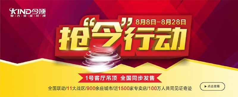 2016年8月8日,在總部的策劃推動下,搶今行動在全國范圍內(nèi)開啟。借助備受矚目的1號客廳吊頂在全國首發(fā)的影響力,全國900余座城市,1500家今頂專賣店同步開啟尊享金色服務(wù)、參與抽獎大趴等超多優(yōu)惠,100多萬人共同體驗到了今頂1號客廳的產(chǎn)品魅力。