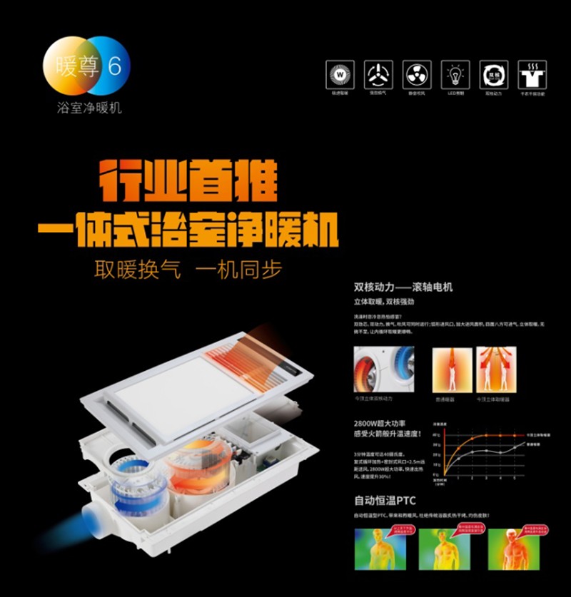 2016年11月,暖尊6一體式浴室凈暖機的正式上市,區(qū)別于傳統(tǒng)的浴霸和浴室暖空調(diào),暖尊6通過雙核動力、智能控制、遠(yuǎn)距送風(fēng)等多方面的技術(shù)革新,為消費者打造出智美凈暖的浴室體驗。歷經(jīng)6年不斷迭代的暖尊系列,已為千萬用戶提供既溫暖又潔凈的整體浴室環(huán)境。