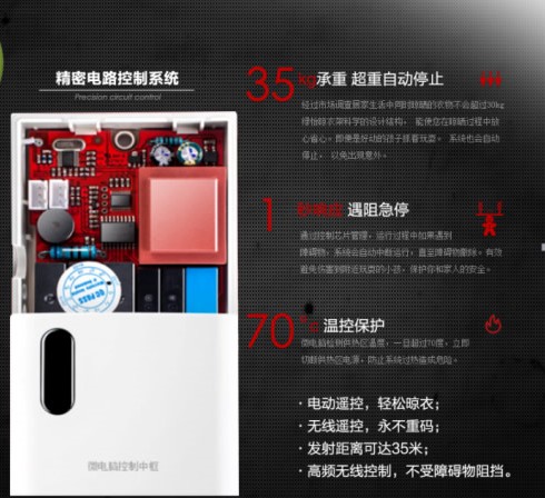 全嵌入式安裝,5重安全防護。過壓,過流,過載,過熱溫控,遇阻急停。什么寶寶在陽臺玩耍,你在洗衣做飯照看不住啦,那都是不存在的事,今頂晾衣架幫您看的好好的。