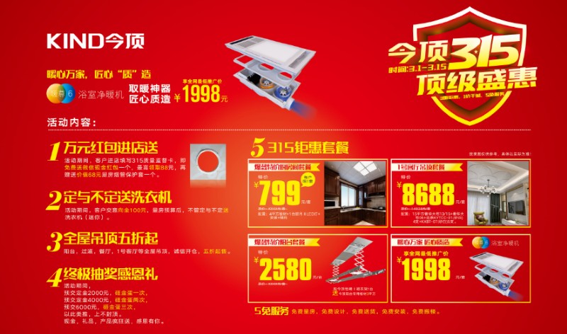 萬元紅包進店送:活動期間,客戶進店填寫315質量監督卡,即免費送微信現金紅包一個,最高領取88元,再贈送價值68元廚房煙管保護套一個。