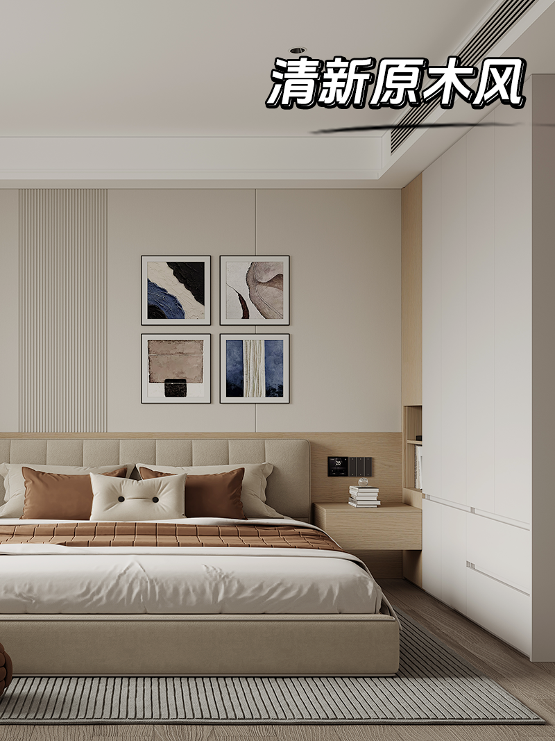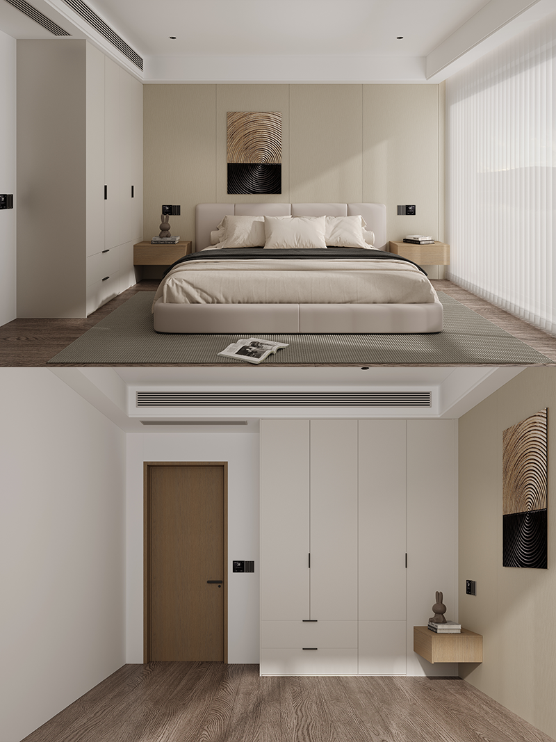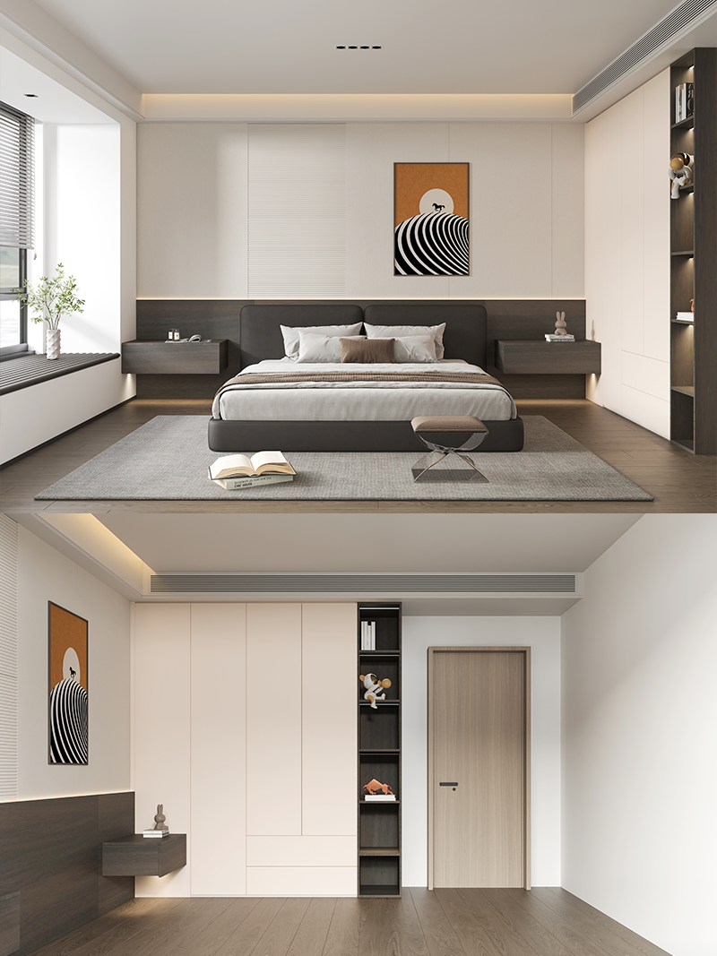 白+原木色,YYDS的原木風經典配色。將墻面、床頭柜和衣柜通過撞色拼接的方式完美銜接,整體感超然一絕!床頭柜采用開放格組合形式,方便常用物品的拿放,同時打破整體衣柜的單調感,造型更顯精致高級。